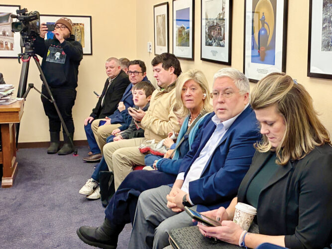 Gov. Patrick Morrisey (second from right) and First Lady Denise Morrisey attend a House Finance Committee meeting Monday. Morrisey has been critical of a bill in committee that would make reforms to the Hope Scholarship educational voucher program.