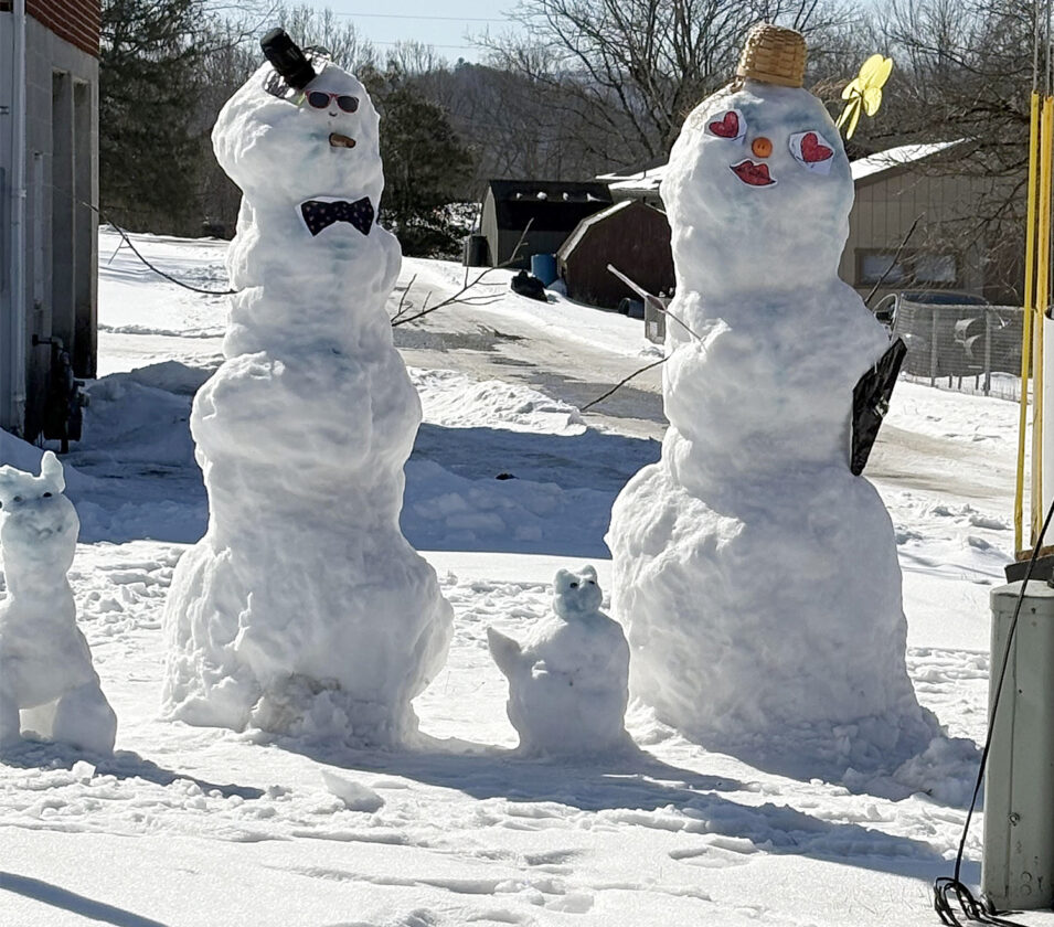 Submitted photo A ‘snow family’ — consisting of a snow man, his wife, and their pet cat and dog — greet drivers at the top of Wilson Hill in Elkins.