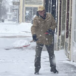 Tony Daft, left, shovels snow from in front of T.D.’s Classic Tees. Daft owns the business that is located on Third Street in Elkins.
