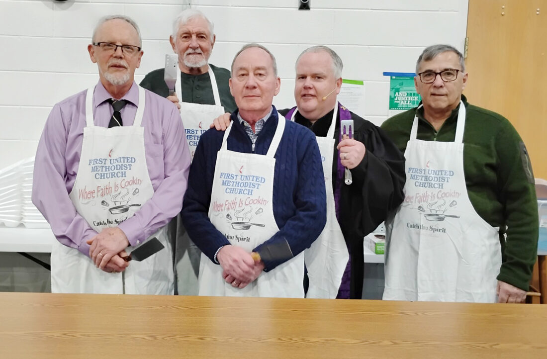 Submitted photo Men working at the annual Pancake Feed Saturday at the First United Methodist Church in Elkins from 7 a.m. to 1 p.m. will include, from left, Bob Sponaugle, Jeff Trulik, Vic Simmons, Pastor Tim Edin and Richard Smith.