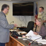 After the Saturday night meeting, George was sworn in by Burns, and signed paperwork related to the appointment.