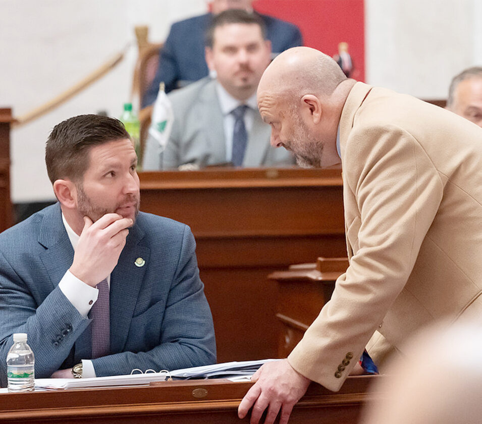 Photo courtesy/WV Legislative Photography Senate Finance Committee Chairman Jason Barrett, left, consults with a staff member prior to Friday’s Senate floor session.