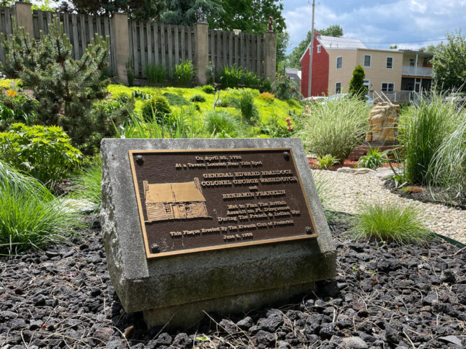 This plaque in Frederick, Md., highlights the 1755 meeting between Gen. George Braddock, then-Col. George Washington and Benjamin Franklin sits near the spot in Frederick where they met to discuss plans to attack Fort Duquesne at Pittsburgh.