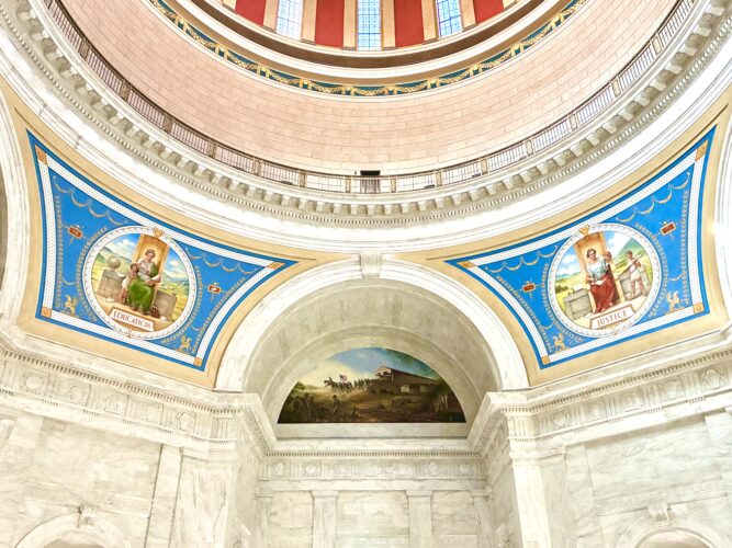 Murals at the State Capitol Building depict representations of Education, Justice, and the Civil War Battle of Philippi.