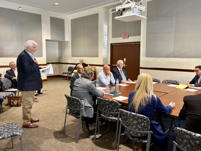 Kanawha County attorney Harvey Peyton (left) addresses members of the Capitol Building Commission Tuesday afternoon urging members to re-do the murals in the upper rotunda of the State Capitol Building or agree to restore one of the murals that includes former governor Jim Justice’s pet Babydog to remove the dog.