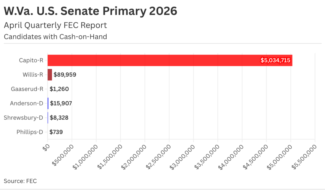 Charleston resident Rio Phillips, a transplant to the state in 2020, raised $5,237 during the quarter and $12,001 election cycle-to-date, leaving him with $739 in cash-on-hand after expenses. Former Senate President Jeff Kessler and South Charleston attorney Thornton Cooper had no available FEC campaign finance reports.