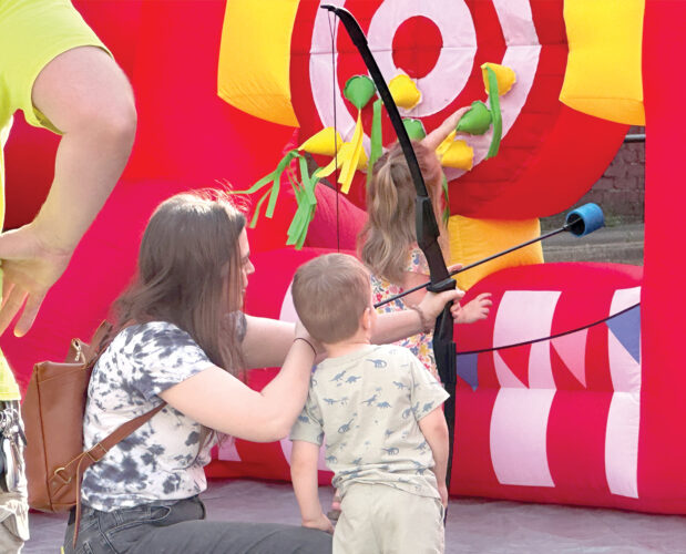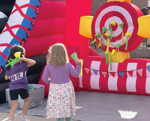 Two kids throw velcro cones at an inflatable target provided by Third Street Rentals during the Tygart Together block party.