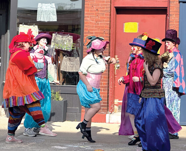 Dressed as clowns, apprentices with the Old Brick Playhouse dance along to a song Crandall Creek is performing during the Tygart Together block party.