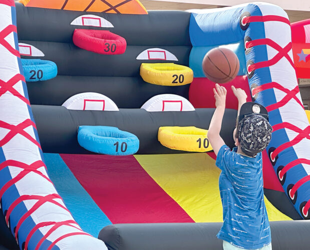 A kid shoots a basketball in hopes of it going in the 30-point hoop during the block party.