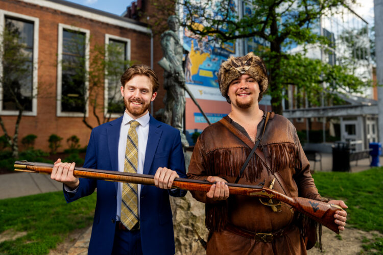 Reese Allen, left, officially took over as the 72nd WVU Mountaineer mascot during the Passing of the Rifle ceremony with Cade Kincaid, the 71st WVU Mountaineer mascot, at the Mountainlair on April 17.