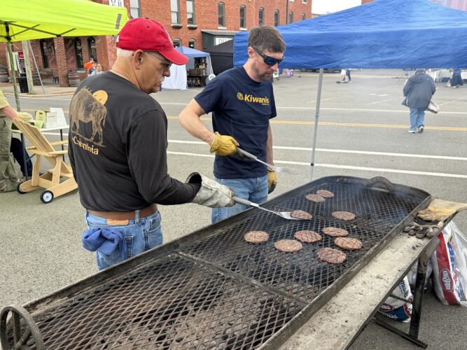 Elkins Kiwanis Club members Rocky VanNoy, left, and Brent Evick grill up some Ramp Burgers during the 16th Annual Ramps and Rail Festival held Saturday at Elkins Town Square.