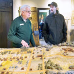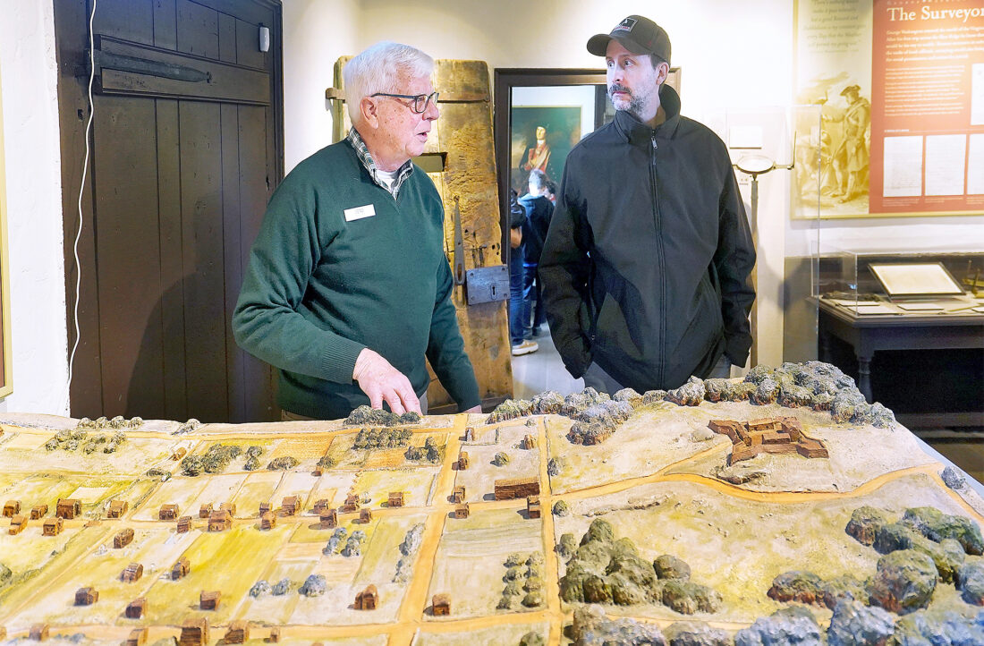 Gene Schultz, left, a volunteer at George Washington’s Office Museum, talks with visitor Brian Armel about what Winchester, Va., was like in the mid-1700s. In front of him is a scale model of Winchester circa 1755, when George Washington was overseeing the construction of Fort Loudoun in Winchester. The fort is on the far right of the model. All that remains of the fort is a well.