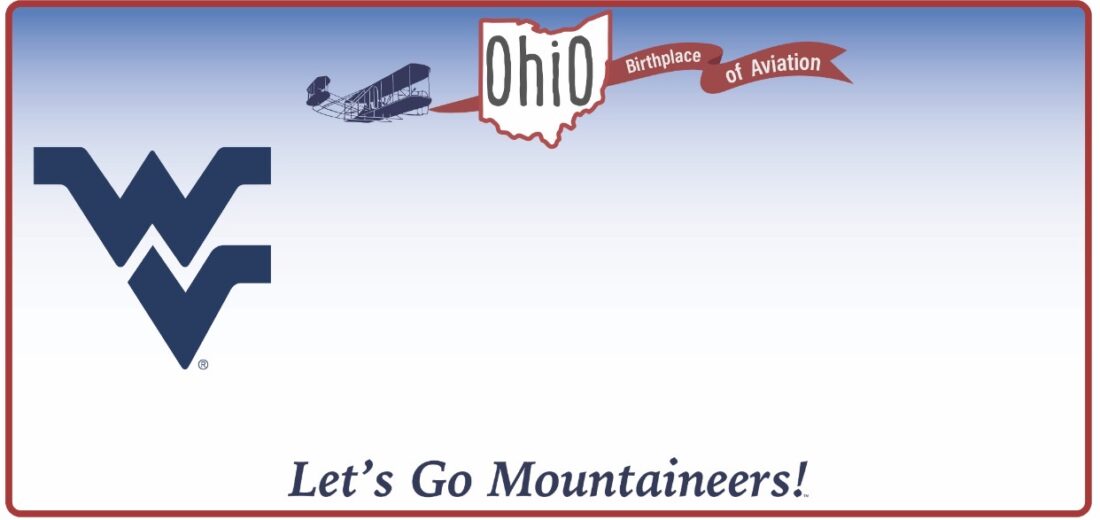 The plate will feature the immediately recognizable “Flying WV” logo that adorns most WVU items and apparel. Across the top will be the outline of the state of Ohio and its “Birthplace of Aviation” logo. Across the bottom will be a phrase familiar to all WVU fans – “Let’s Go Mountaineers!”