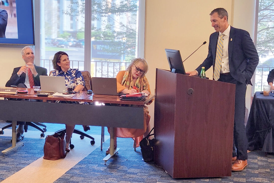Ben Conley/The Dominion Post Chris Kabourek addresses the WVU Board of Governors during its April 17 meeting.
