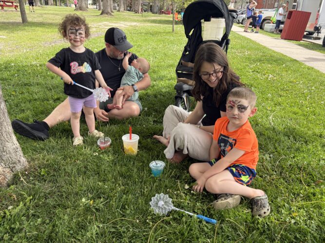The Cooper family, from left, Eloise, Nick, Slater, Sarah, and Asher, take a break from the hot sun underneath a tree at Elkins City Park during Saturday's Earth Day celebration and Spring Expo.