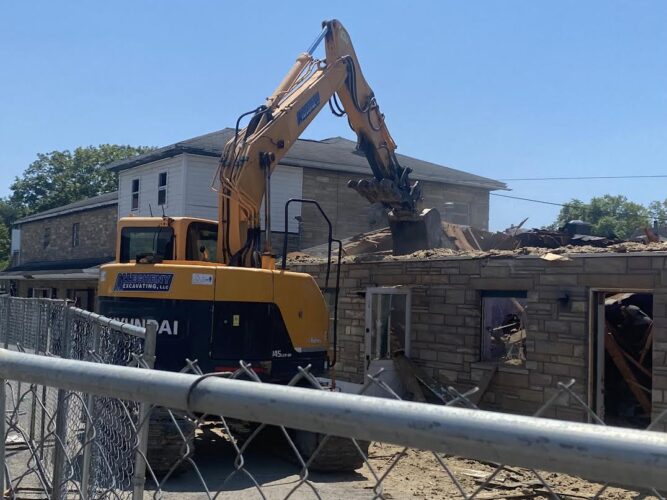 A demolition crew begins tearing down the former Four Seasons Motel in Elkins early Monday afternoon. The city purchased the property in May for $135,000. Officials plan to transform the property into a greenspace or welcome area.