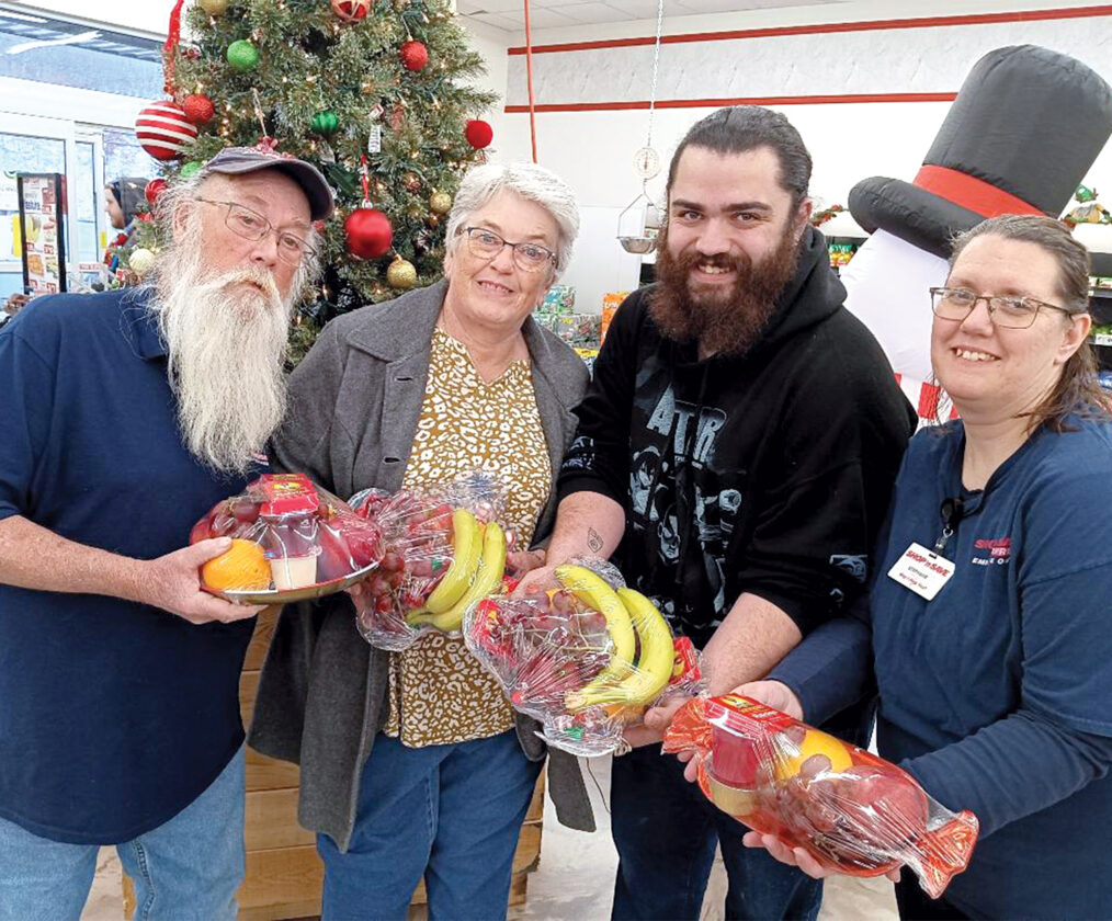 Submitted photo From left, Butch Alt, Mt. Carmel Baptist Church Ladies Missionary Society President Trish Thomason, Shop ‘n Save Manager Seth Croston and Stephanie Collins each display a prepared holiday fruit basket.
