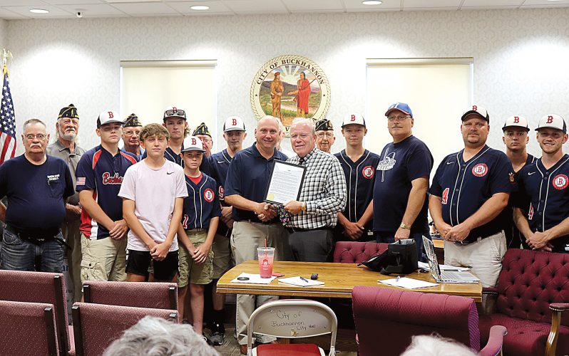 Friday, Aug. 16 was proclaimed Frank Bartlett American Legion Post 7 Baseball Team Day in Buckhannon honoring the members of the 2019 team, coached by Kevin Boring. The team has supported the veterans by inviting them to games and marching in the annual Veterans Day parade. The team includes Alek Seech, Ryan Smith, Logan Bailey, Nick Calef-Boring, Andrew Herron, Tim Phillips, Cole Hoover, Elijah Arbogast, Casey Hamner, Logan Whitehair, Jonathan Warner, Trey Leigh, Josh Riffle, Wesley Rosencrance, Andrew Carrico, Ryan Strader, Brady Hurst, Zachary White, Isaac Lane, Hunter Stone, Johnny Haddix, Jay