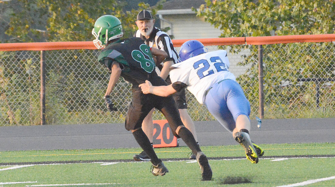 Elkins Middle School’s Randal Marks picks up positive yards on a punt return as Barbour County’s Landyn Carpenter (22) lunges to make the tackle attempt Thursday night at EHS Field.