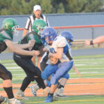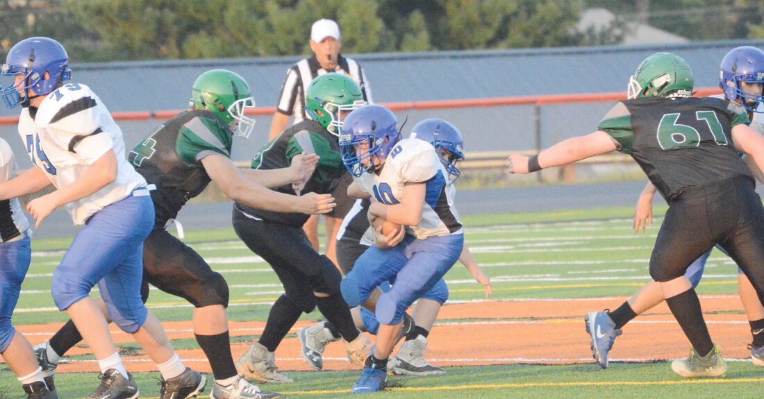The Inter-Mountain photos by Joey Kittle Barbour County’s Mason Jones looks for yardage as Elkins Middle School defenders move in for the stop Thursday night at EHS Field.