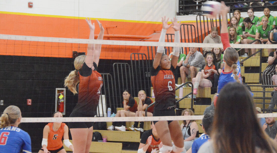 The Inter-Mountain photo by Joey Kittle Elkins High’s Jasmine Workman, left, and Marissa Brenwalt go up for a block during Wednesday’s match against Gilmer County at Richard P. Simmons Memorial Gymnasium.