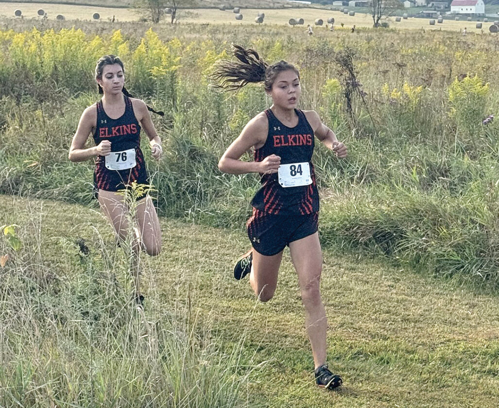 Submitted photo Elkins’ Julia Biola, left, and Emilia Tenney, right, on their way to a one-two finish at Saturday’s Bearcat Invitational.