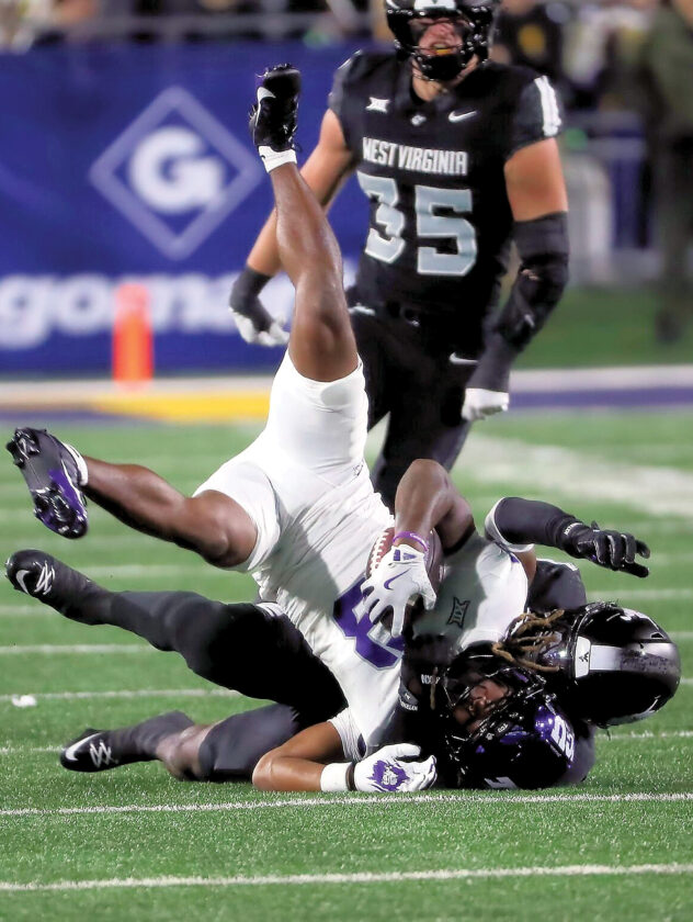 BlueandGoldNews.Com WVU’s Fred Perry delivers a hit against TCU on Saturday.
