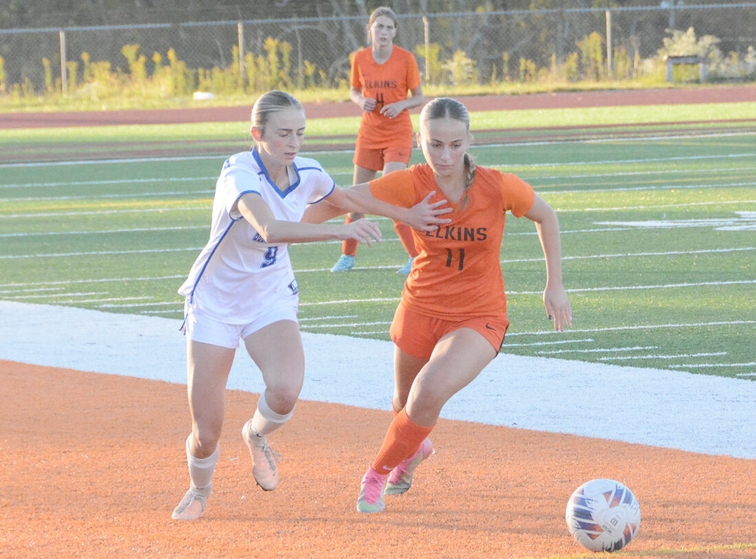 The Inter-Mountain photo by Joey Kittle Buckhannon-Upshur’s Rylen Carlyle (9) and Elkins’ Lillyana Betler (11) pursue a loose ball Thursday night at Tiger Stadium. Carlyle had one of the goals for the Lady Bucs in a 3-0 win.