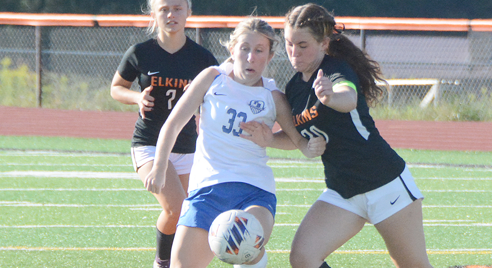 File photo Elkins’ Greylyn Belcher, right, battles a Fairmont Senior player for possession during action from this season.