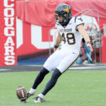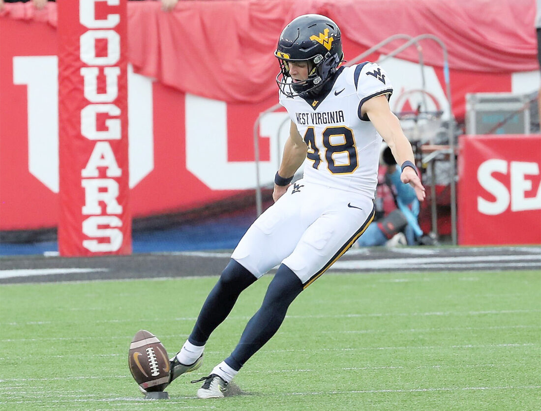 Photo courtesy of BlueGoldNews.com Senior walk-on kicker Nate Flower kicks off during WVU’s game at Houston.