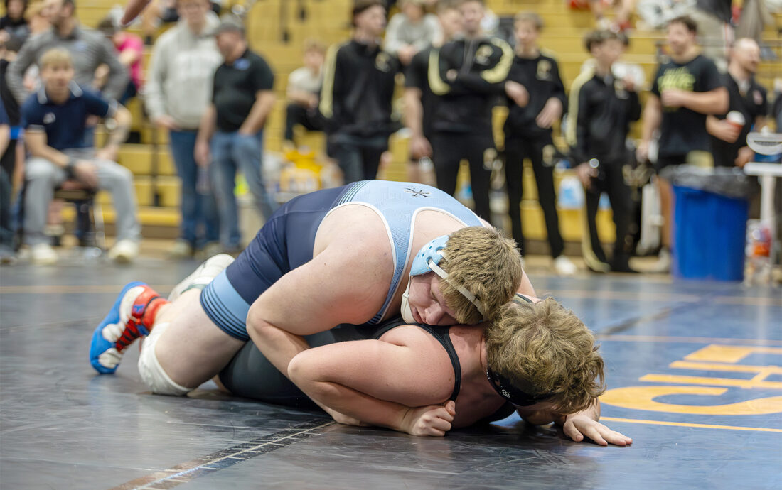 The Tigers’ Logan Stewart, shown battling Lewis County’s Will Hovis, turned in a third-place effort in the Big 10 tourney.