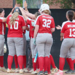 - Tygarts Valley’s Addie Riddle (10) is greeted by teammates after hitting a two-run homer against Elkins on Monday evening.