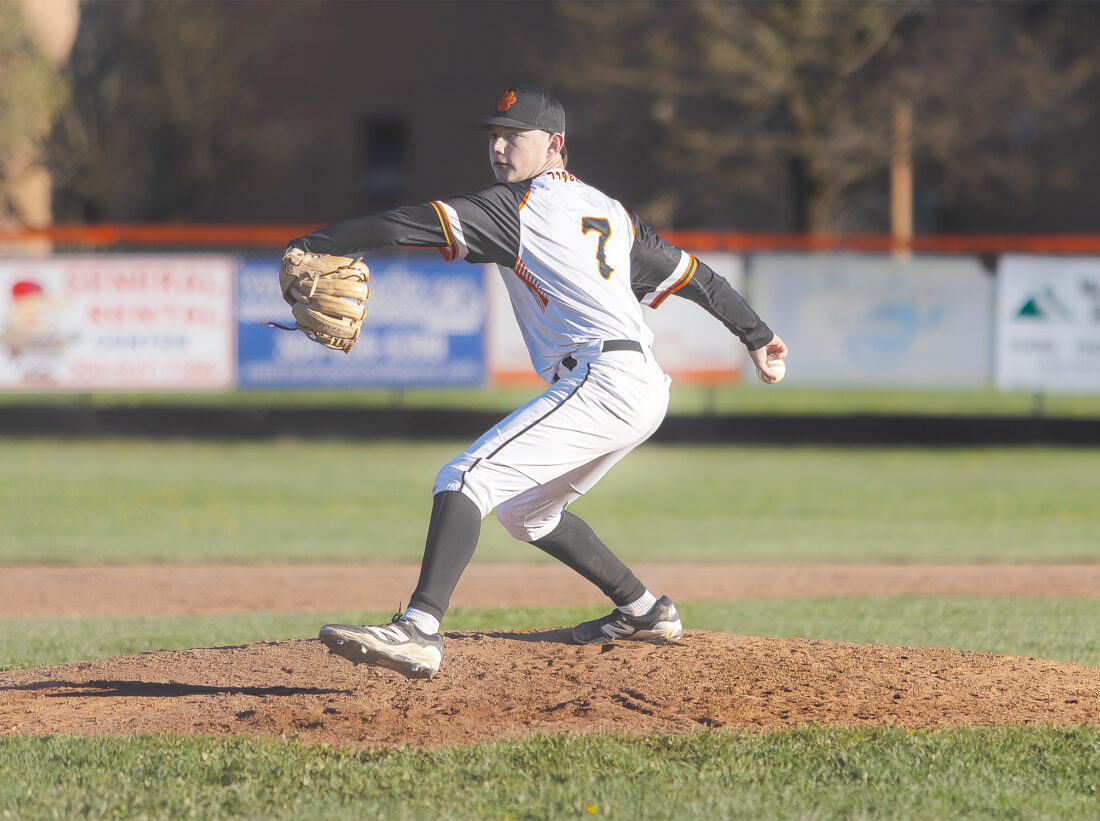 The Inter-Mountain photo by Steve Chamberlain Elkins High’s Dyer Barger delivers a pitch against Lewis County on Tuesday evening. Barger had 10 strikeouts in the Tigers’ 12-6 setback.