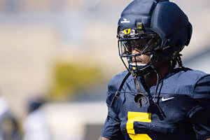 Photo by Benjamin Powell/The Dominion Post WVU wide receiver Jaden Bray at spring practice after recovering from a season-ending injury in 2025.